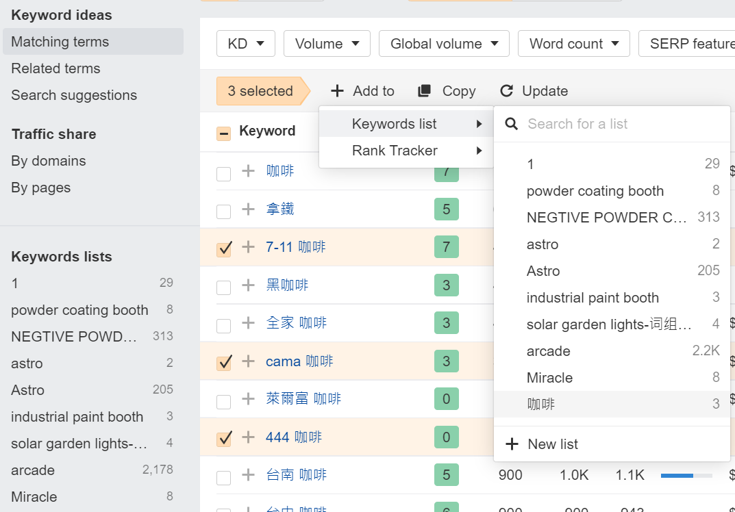 簡單分享操作邏輯 :將你腦力激盪後想到的主題放入關鍵字研究工具(如 : Ahrefs Keywords Explorer, Google Keyword Planner, MOZ, SEMrush 等)中,查看相關的關鍵字,並將任何你覺得有用的內容主題 ( 以咖啡為例 )添加到你的關鍵字列表中。