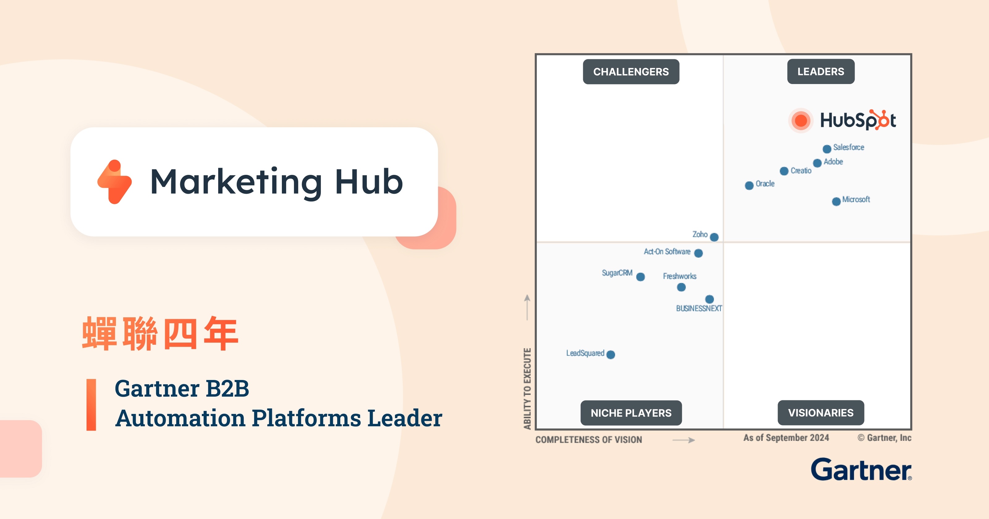 HubSpot 在 Gartner 2024 年 B2B 行銷自動化平台魔力象限報告中連續第四年被評為領袖等級,反映了 ...