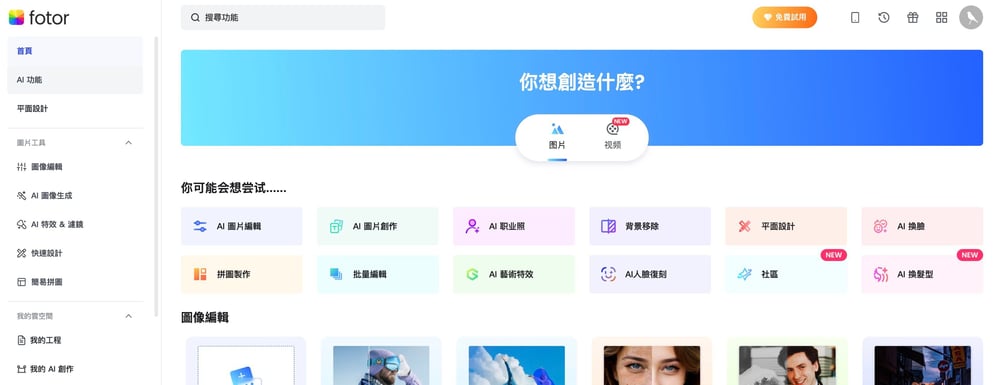 - Fotor:支援繁體中文,內建去背、美化等編輯功能,免費版即可滿足日常需求。