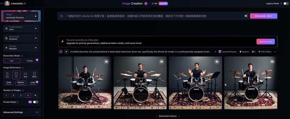 - 中文支援:Leonardo.Ai 不支援中文介面,操作界面為英文;但可以使用繁體中文或簡體中文輸入提示詞 (Prompt),產出圖片品質優良。